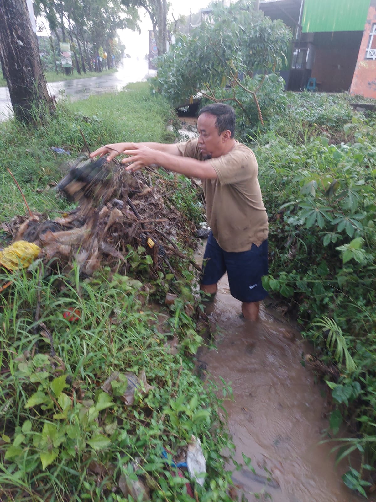 Di lokasi sebelah utara Puskesmas Ngariboyo, Kang Suyat mendapati saluran air tersumbat tumpukan sampah. Akibatnya, air menggenang hingga setinggi sepinggang orang dewasa.