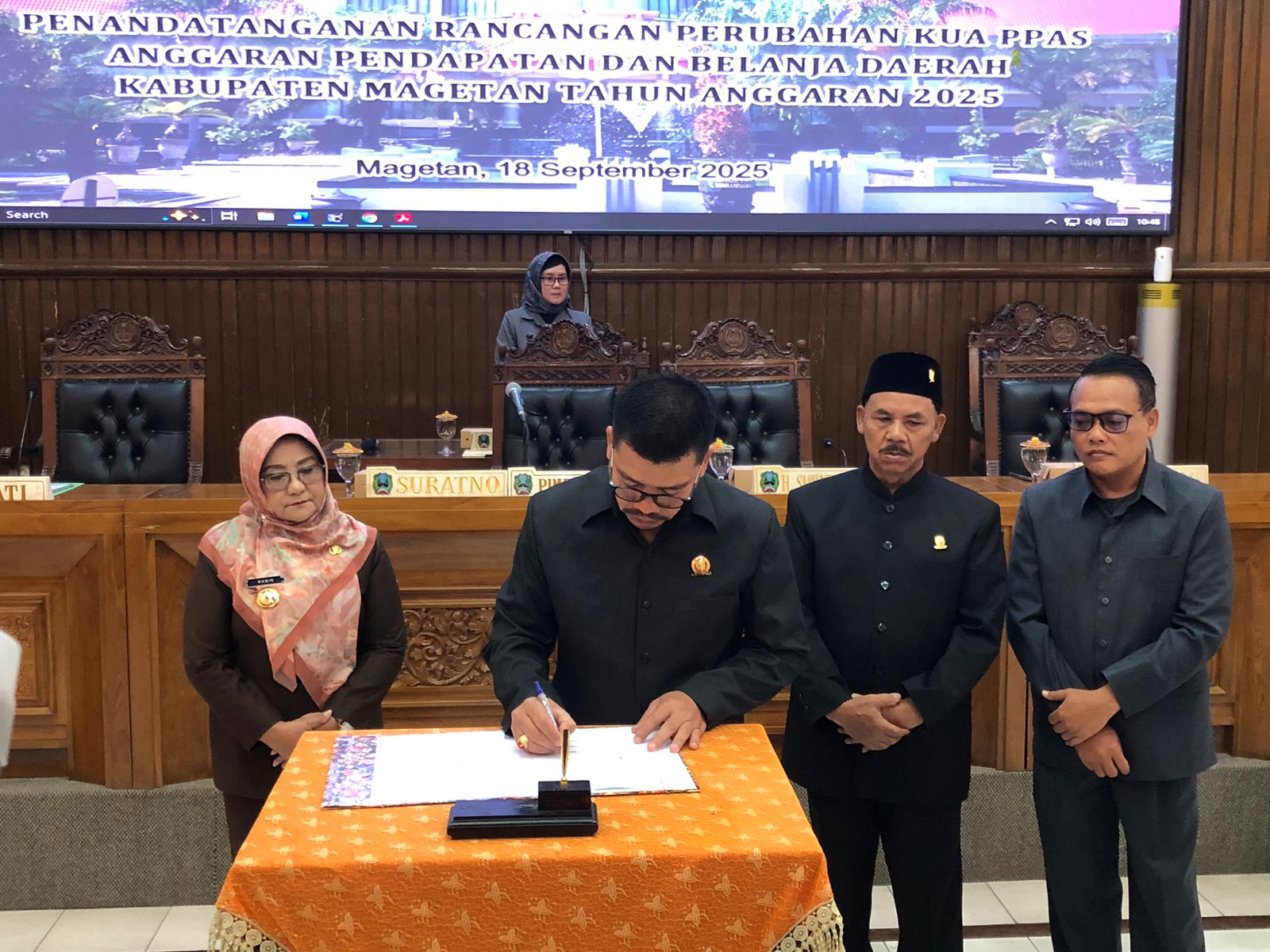 Ketua DPRD Magetan, Suratno, saat menandatangi rancangan perubahan KUA-PPAS APBD Magetan tahun 2025, dalam rapat paripurna, Kamis (18/09/2025).