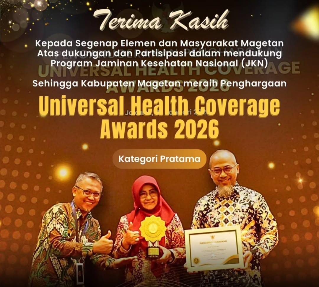 ProKontra, Magetan – Kabar gembira yang patut dirayakan bersama telah menggema di seluruh pelosok Kabupaten Magetan! Pemerintah Kabupaten Magetan, di bawah kepemimpinan Bupati dan Wakil Bupati, berhasil meraih penghargaan bergengsi yaitu Universal Health Coverage (UHC) Awards 2026 dalam kategori Pratama. Penghargaan ini menjadi bukti nyata bahwa upaya keras dalam meningkatkan kualitas pelayanan kesehatan bagi seluruh masyarakat Magetan telah mendapatkan pengakuan tingkat nasional.