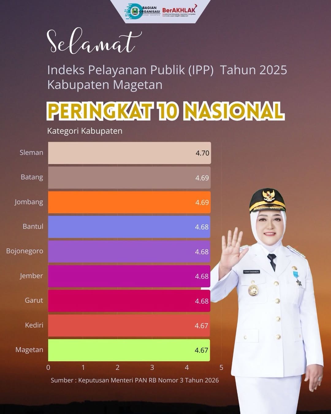 ProKontra, Magetan – Kinerja pelayanan publik Pemerintah Kabupaten (Pemkab) Magetan kembali mencatatkan prestasi di level nasional. Berdasarkan Keputusan Menteri Pendayagunaan Aparatur Negara dan Reformasi Birokrasi (PAN RB) RI Nomor 3 Tahun 2026, Magetan menempati peringkat ke-10 nasional kategori pemerintah kabupaten dalam Indeks Pelayanan Publik (IPP) tahun 2025.
