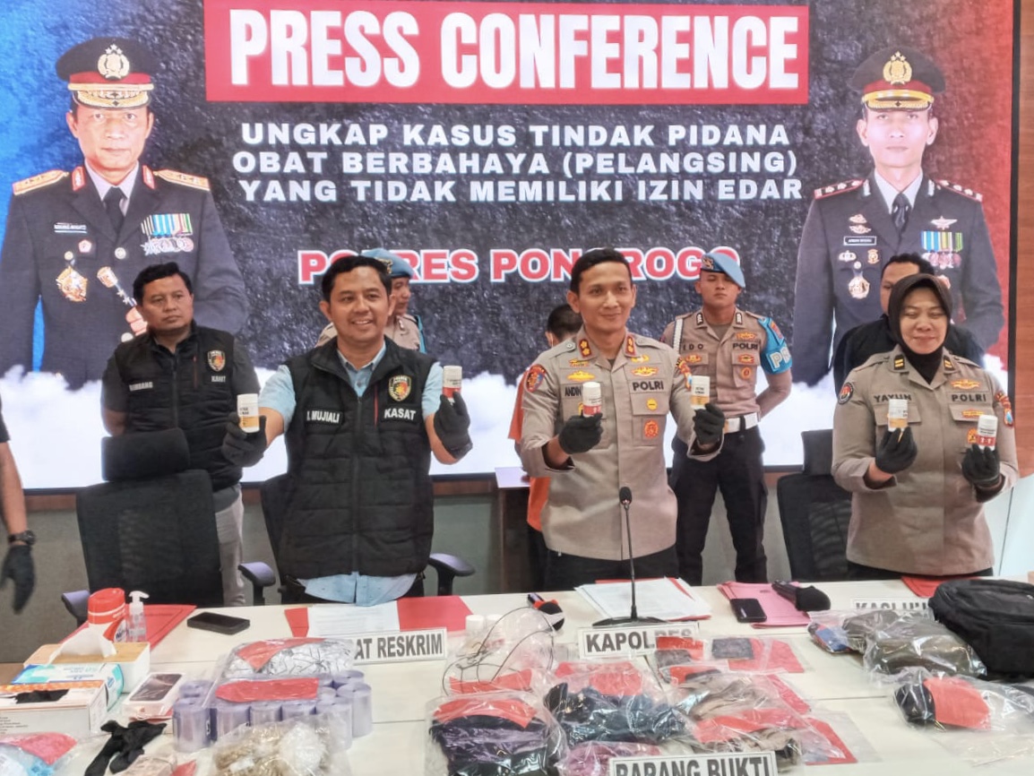 Kapolres Ponorogo AKBP Andin Wisnu Sudibyo menyebut, barang bukti yang diamankan cukup besar. Polisi menyita 3.500 botol obat pelangsing, 90 botol vitamin penambah berat badan, 55 ribu kapsul tanpa keterangan kandungan, ribuan botol kosong, stiker label, paket siap kirim, hingga uang tunai, ponsel, dan peralatan pengemasan.
